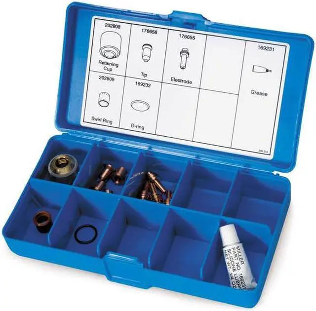 Plasma Torch Consumable Kit, For Use With Miller Electric Torches ICE 27C/T, Includes 1 Shield Cup, 5 Tips, 5 Electrodes, 1 Swirl Ring, 1 O-Ring, and Silicone Grease. This item has been restricted from sale in the following state (s): []