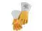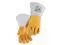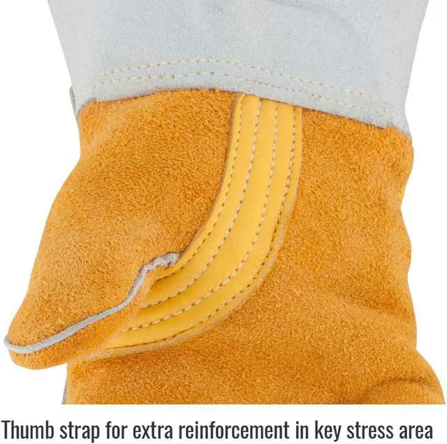 Yellow/white premium grain elkskin stick welding gloves, with a Nomex lined back. Unlined reversed grain palm, with thumb strap and rigid cuff. Kevlar stitching for spark and abrasion resistance. Size Large. Package of 1