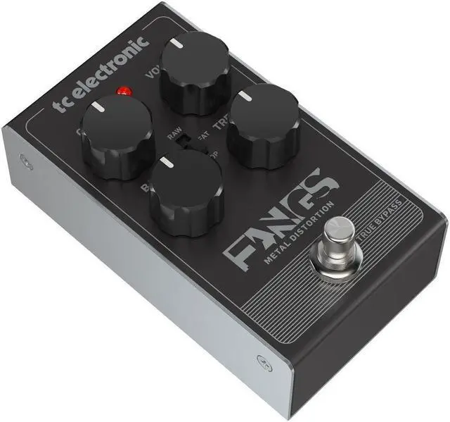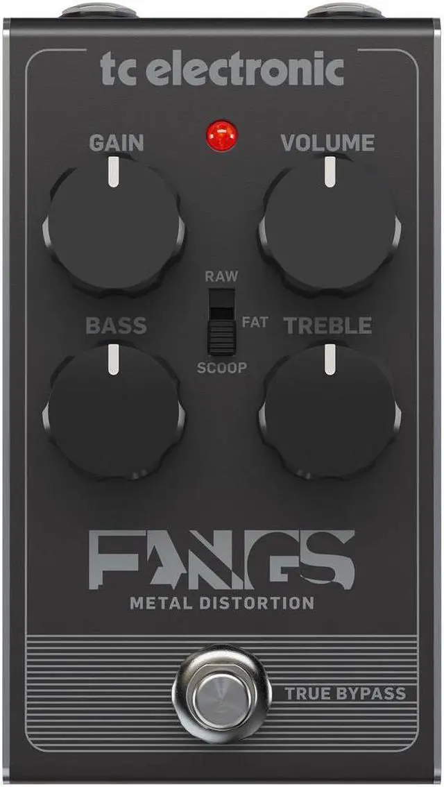 This pedal is designed with an easy-to-use control layout, including Gain for drive control, Volume for output level, Bass for bottom-end settings, Treble for high settings, and a 3-position midrange selector (Raw/Fat/Scoop) for ultimate definition. Unleash your sonic onslaught with the FANGS Metal Distortion Pedal and take control of your tone.