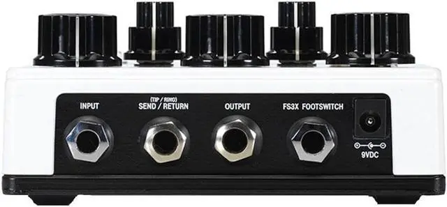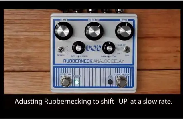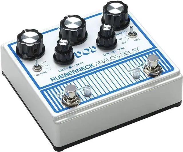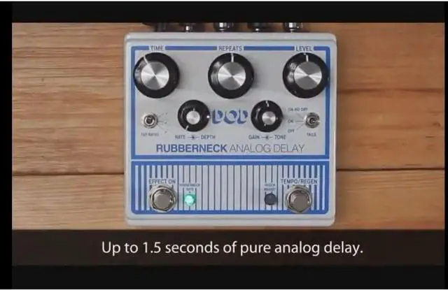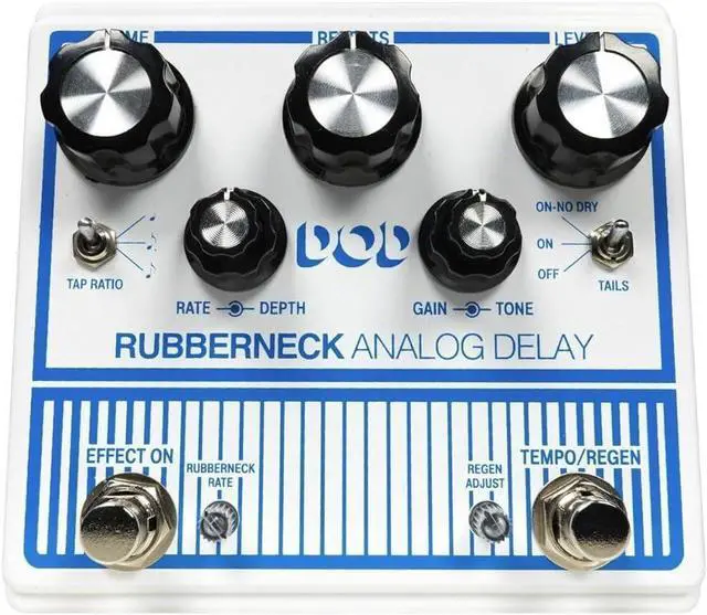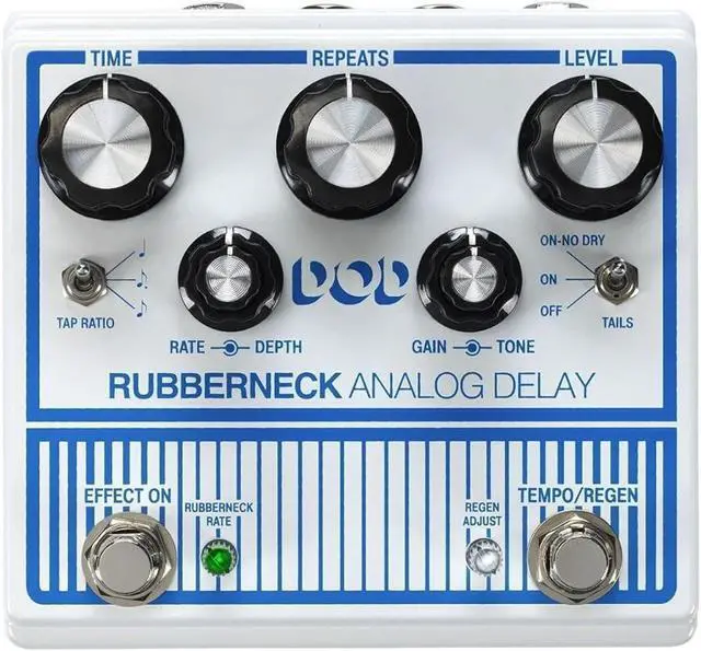 The DOD Rubberneck Analog Delay has double the features with the cool new double-wide chassis. The Rubberneck boasts over a second of warm and musical 100% analog repeats you crave, along with tap-tempo, subdivisions, and tails. Double concentric knobs give you independent control of the Modulation Rate and Depth as well as Gain and Tone of the delay. Double footswitches allow for unique extended features like user customizable momentary control of oscillation and momentary control of the dizzying pitch sweep of Rubbernecking. These extended features are controlled by individual clear mini knobs that double as multi-color LED status indicators. Feedback loop send/return, remote footswitch control, true bypass, and rugged metal construction, make the Rubberneck Analog Delay the must have delay of the year. The Rubberneck also has jacks to allow FS3X 3-button remote foot switching, and a send and return so you can add external effects to the delay path. The DOD Rubberneck uses a 9VDC power supply to easily integrate into your existing pedalboard.