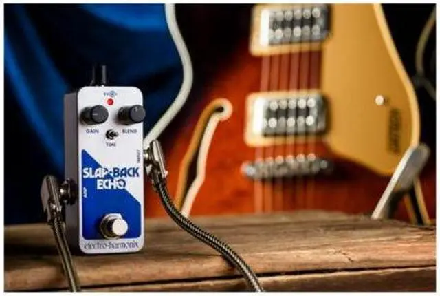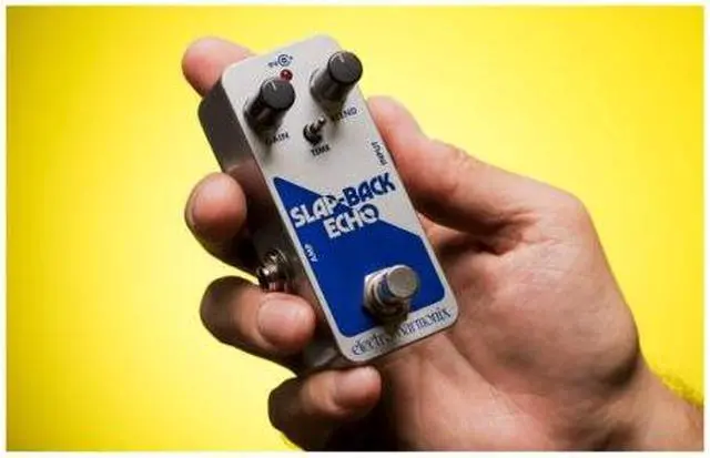 MechanismHoused in EHXs Pico-sized chassis, the Slap-Back Echo features Gain and Blend knobs as well as a Time switch. The Gain knob controls the input signal before the echo circuit and adjusts the overall output volume with a boost of up to +20dB. The Blend knob mixes the dry and echo signals from 100 percent dry to 100 percent echo. The Time switch selects between three different delay times: 45ms, 65ms, and 100ms.