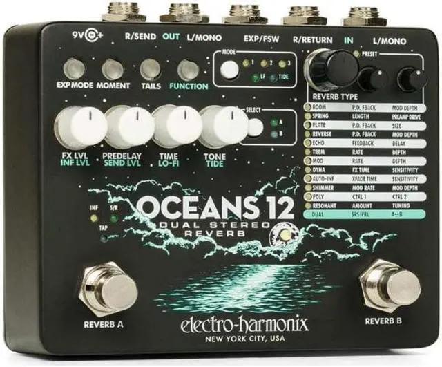 The Electro Harmonix Oceans 12 features two simultaneous, independent, stereo reverb engines, series and parallel control for the dual reverbs, 24 presets, and advanced I/O allowing for stereo in/out or mono send/return with pre and post reverb options. The pedal also includes a new Tide Control for stereo image alteration, a Lo-fi Control, an infinite attenuation control, an input jack for external expression, and a 3-button footswitch control. A Tails switch provides a choice of whether the reverb effect fades out naturally or stops immediately when the pedal is switched to bypass. In most settings, the pedal can produce infinite reverb, which can be played with a different reverb effect.