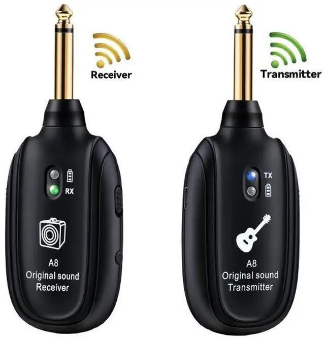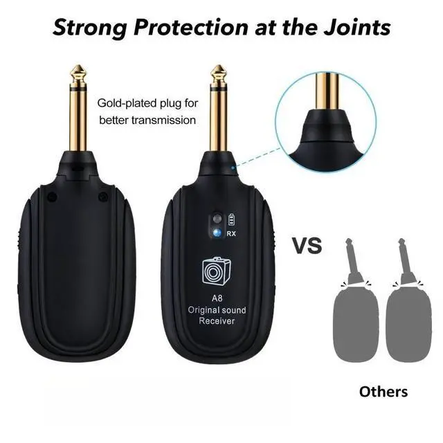 Compact & Durable DesignThe wireless guitar transmitter and receiver are crafted from high-quality ABS plastic, built to withstand the demands of frequent touring and harsh environmental conditions. Its sleek, compact design fits seamlessly on any pedal board, saving space while maintaining practicality and durability for long-term use.