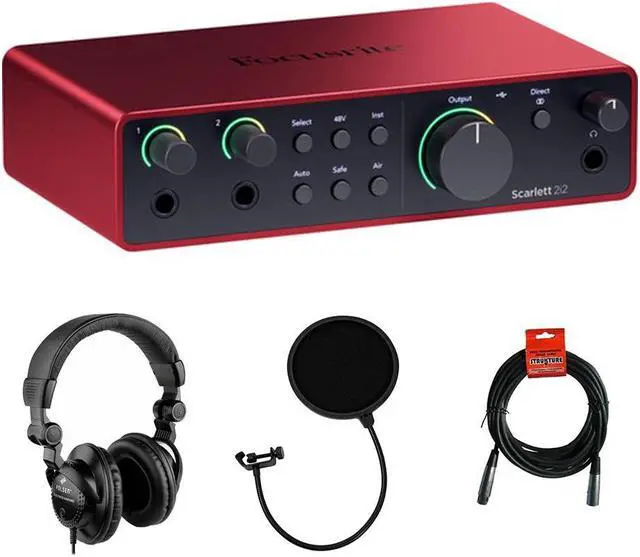Focusrite Scarlett 2i2 (4th Generation) 2-in / 2-out USB-C audio interface lets musicians and creators capture high-quality audio with no learning curve, no matter where they go. The 4th Generation model features new ultra-low-noise microphone preamps with up to 69 dB of gain to capture the full potential of your mics. The upgraded, 24-bit / 192 kHz AD/DA converters provide a huge dynamic range up to 120 dB, matching the quality you would find in a pro studio. The new Auto Gain mode automatically sets your recording level, and Clip Safe mode automatically prevents your signal from clipping, ensuring that every take is a keeper. The Loopback feature lets podcasters, gamers, YouTubers, and streamers mix audio from other apps running on the computer, with the audio being recorded through the interface. The 2i2 4th Generation can now work in standalone mode without a computer, useful for live performances or monitoring-only situations. The interface comes with a complete recording toolkit with Pro Tools Artist, Ableton Live Lite, and Focusrite's Hitmaker Expansion software bundle; featuring Auto-Tune Access for Vocals, Softube Marshall Silver Jubilee 2555 for guitar, Native Instruments MASSIVE synth, and more. Bundle with Polsen HPC-A30 Closed-Back Studio Monitor Headphones, Pop Filter and XLR- XLR Cable.