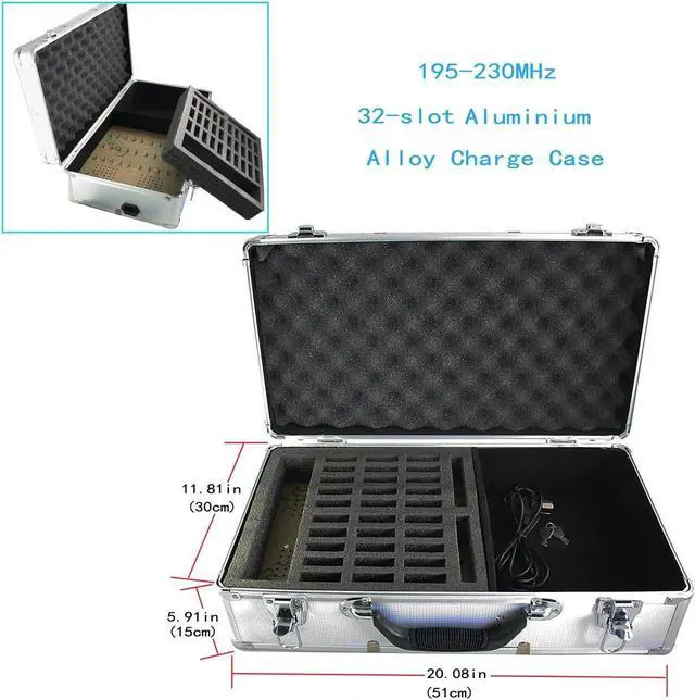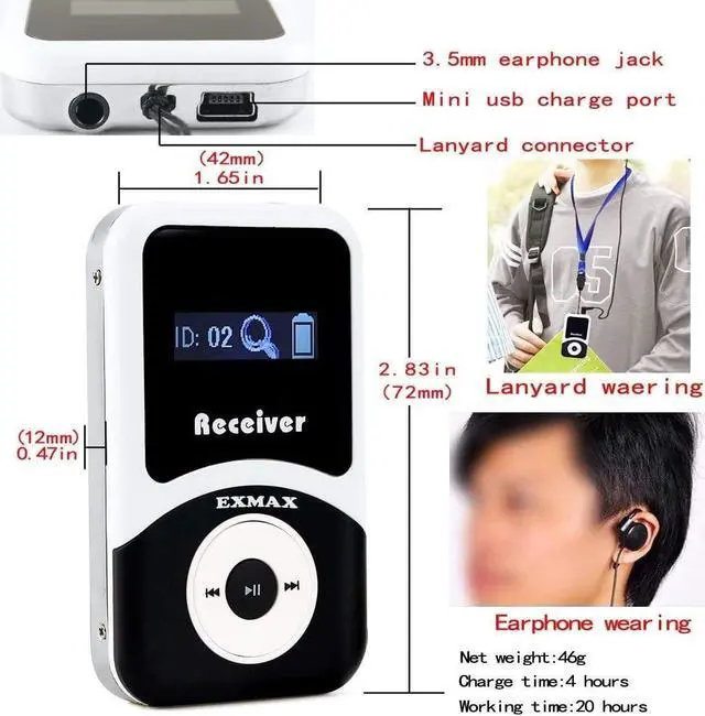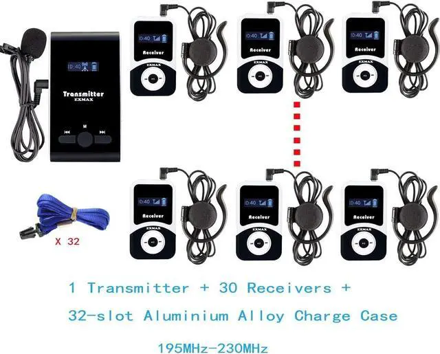 Transmitter weighs 56g and receiver weighs 46g, Small and light for carry or carriage. High S/N Ratio (90dB) ensures clear voice transmission. Long-Lasting Power, both transmitter and receivers are built-in 900mAh lithium upgraded battery to guarantee more than 18 hours working. One transmitter could pair up countless receivers so long as on the same frequency channel. Transmitter has 3.5 mm input jack, it supports AUX( such as MP3, Smartphone, MP4, CD ) and MIC input. 32-slot charging case included.
