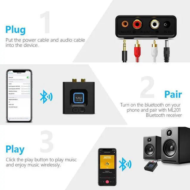 Plug the cables to ML201 Bluetooth audio receiver, turn on Bluetooth on your phone or tablet.