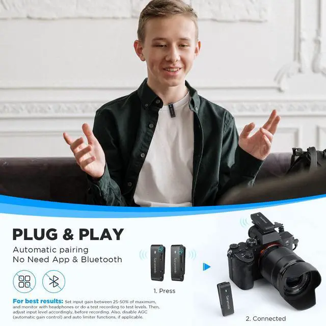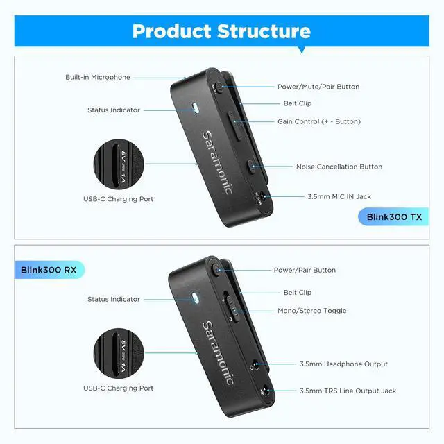 The product is small and can be easily clipped on clothes, and the TX transmitter has gain adjustment, noise reduction and mute functions