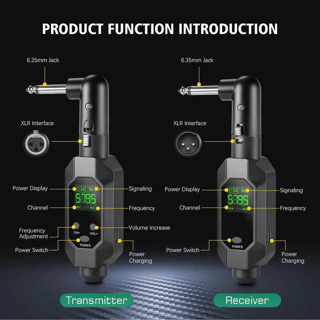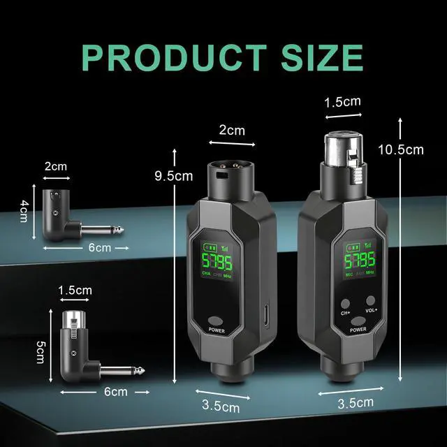 Real Time Clear Display & Switchable VoltageThe XLR wireless transmitter and receiver has a HD display that intelligently shows signal strength, battery level, channel frequency, real-time control of the device status, clear and easy to operate. Switchable operating voltage 0V/5V/48V,Nexilunual plug-on wireless mic adapters are designed specifically for dynamic (5V) and capacitive (48V) microphones.