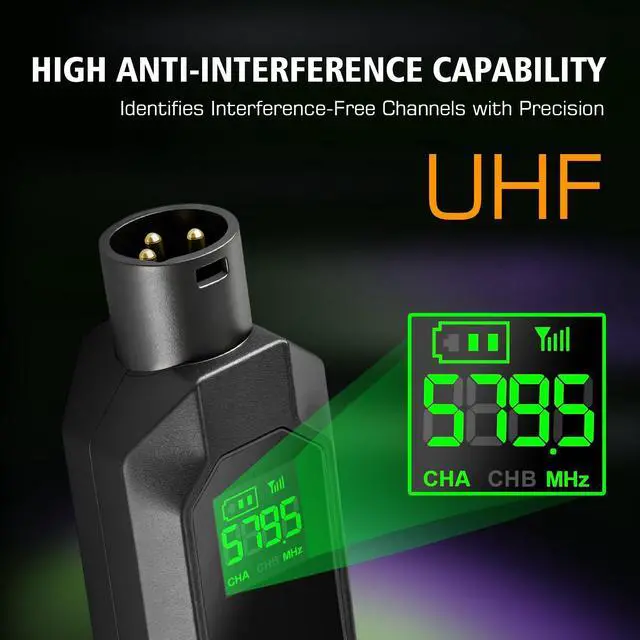 UHF & 164FT Transmission RangeOur wireless XLR transmitter and receiver use stable UHF transmission technology, providing a wireless transmission range of up to 164FT (approximately 50 meters). The wireless microphone transmitters & receivers can completely solve the common disconnection and interference problems in the 2.4GHz or 5.8GHz frequency bands. Even in areas with dense or crowded WiFi, it can ensure smooth and reliable use,eliminating the trouble of wires whether indoors or outdoors.