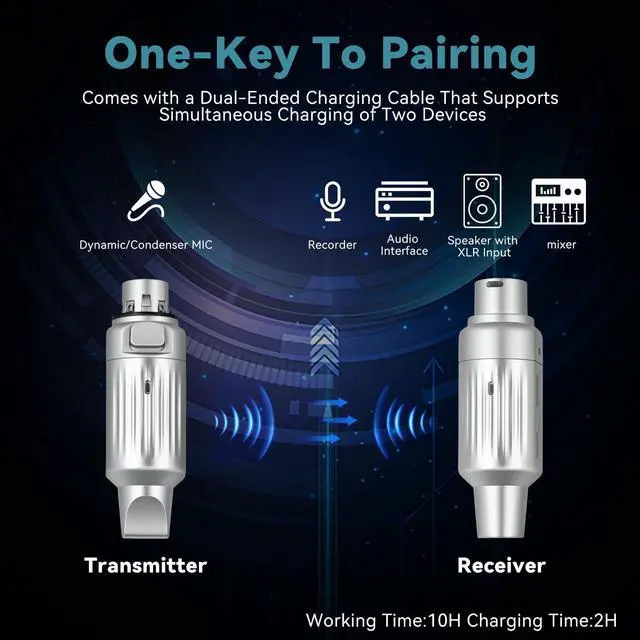 EASTROCK Wireless XLR System instantly transforms your professional wired microphones into a robust wireless setup. Engineered for demanding users, it delivers broadcast-quality 192kHz/24-bit audio with a wide 90dB dynamic range for pristine, uncompromised sound. Its intelligent 2.4GHz auto-hopping technology ensures stable, interference-free operation for up to 7 simultaneous systems over a remarkable 130-foot range. Built for all-day events, the system features a 10-hour battery with clear power indicators and a durable, compact metal body for seamless integration. Offering universal XLR compatibility, it provides true plug-and-play simplicityautomatically pairing on startupwith dynamic and condenser mics, mixers, and PA systems. Ideal for stage performances, live streaming, wedding ceremonies, and professional interviews, this system is the reliable, high-fidelity wireless audio solution that gives performers and creators the freedom to move without limits.