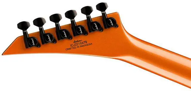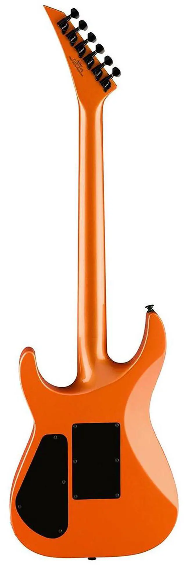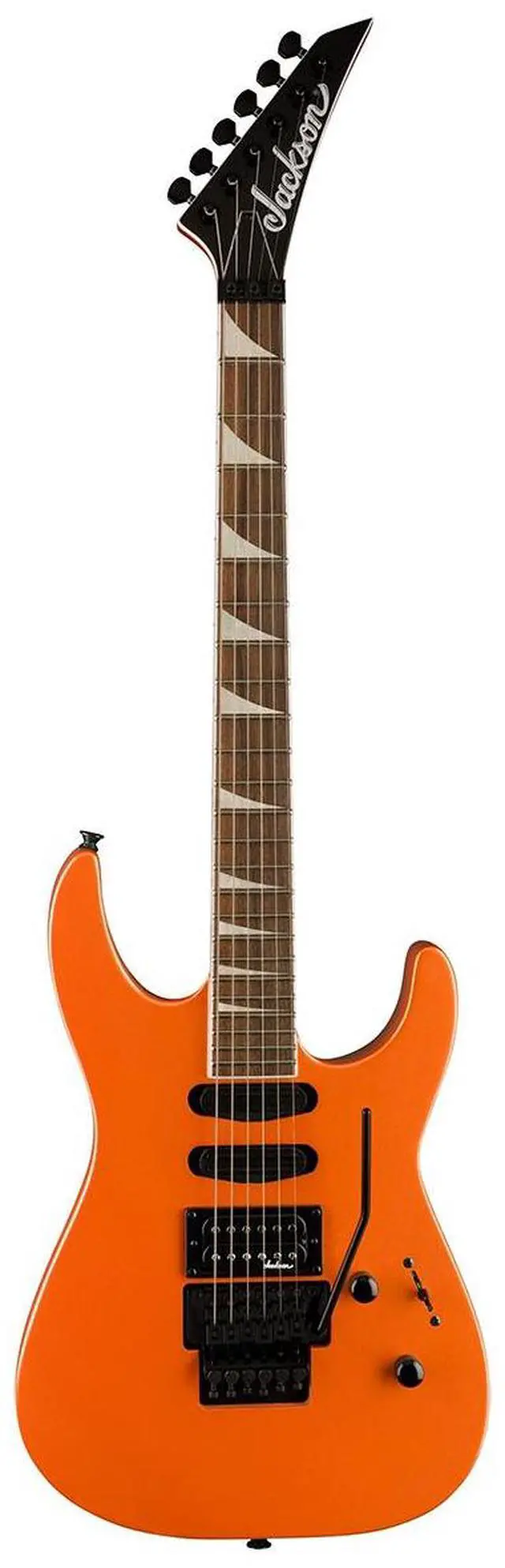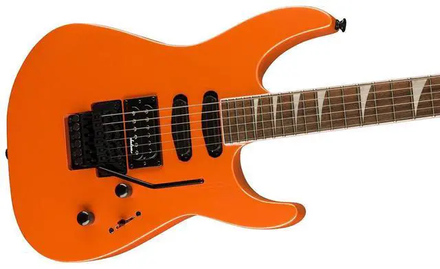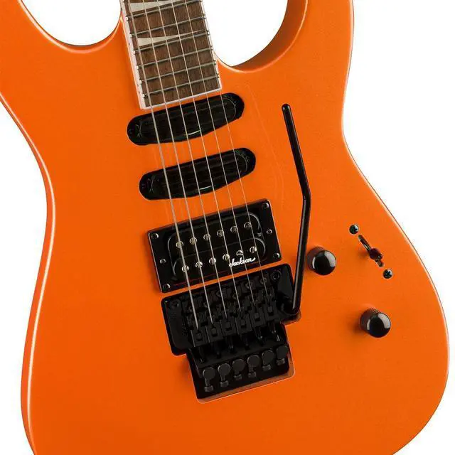 The five-way pickup blade switching, along with single volume and tone controls, allows you to harness the full sonic potential of these pickups. The recessed Floyd Rose Special double-locking tremolo bridge system ensures that your guitar returns precisely to its original tuning after every dive-bomb or flutter. Visually striking in its Lambo Orange finish, the X Series Soloist SL3X DX is adorned with Jackson's traditional appointments, including black hardware, knurled dome-style control knobs, pearloid sharkfin fingerboard inlays, zebra pickup bobbins, and the iconic Jackson pointed 6-in-line black headstock. This guitar is not just an instrument; it's a statement of style and performance, ready to meet the demands of any musical genre.