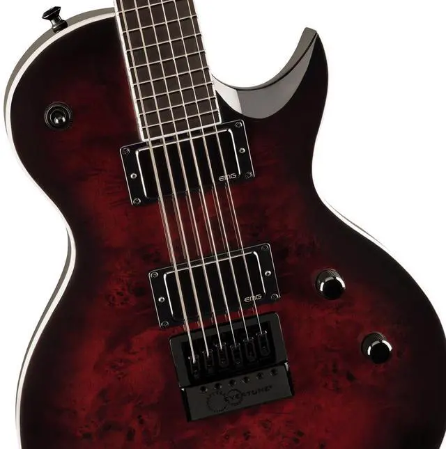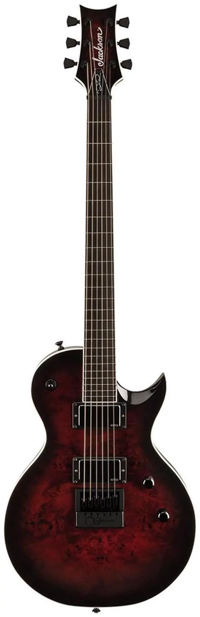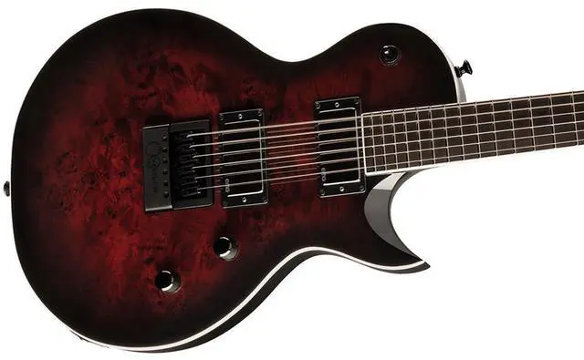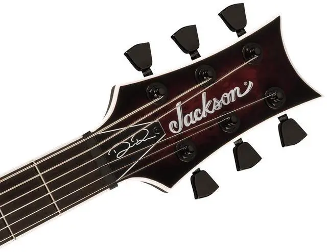 This model is based on Jackson's single-cut Monarkh platform, featuring a 25.5" scale length and a stunning nyatoh body adorned with a poplar burl top. The three-piece nyatoh set-neck is reinforced with graphite, ensuring durability and stability, while the 12" radius bound ebony fingerboard with 24 jumbo frets offers smooth playability and effortless navigation across the fretboard. Equipped with black chrome-covered active EMG 81/85 humbucking pickups, this guitar delivers a powerful and versatile tonal range. The three-way toggle switch and dual volume controls allow you to fine-tune your sound to perfection. The Evertune bridge is a standout feature, providing unparalleled tuning stability and maintaining perfect intonation across the fretboard, even under varying temperature and humidity conditions.