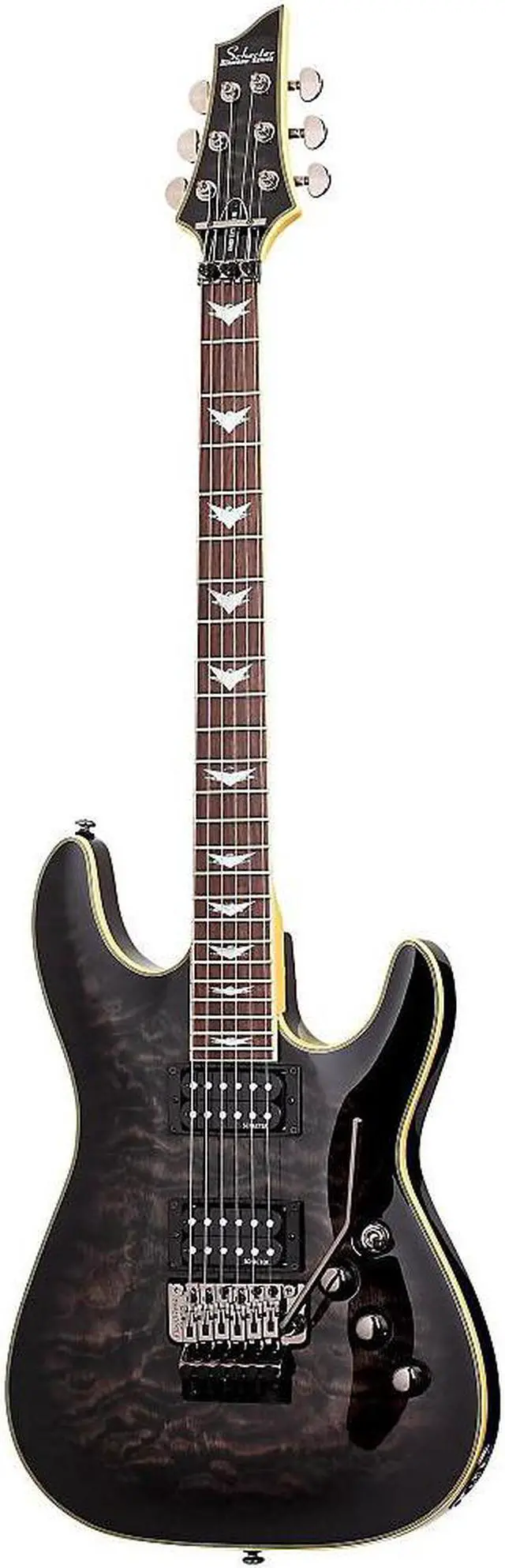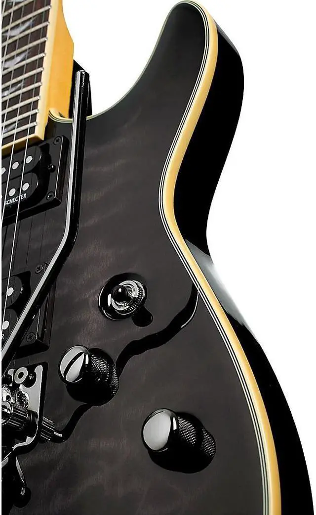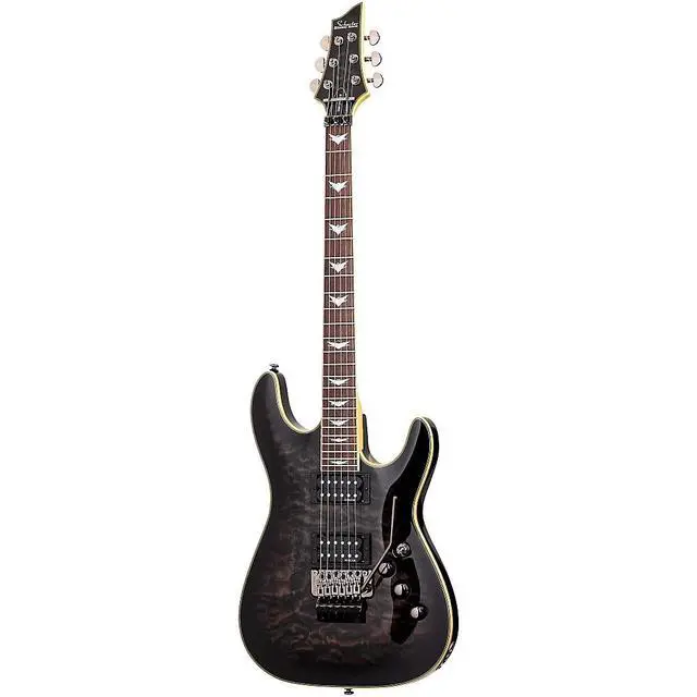The Schecter Omen Extreme-6 FR Electric Guitar is loaded with the features that modern guitarists seek-like the beautifully figured, carved maple top on a basswood body with a comfortable double-cutaway that gives you full access to the fast maple neck fitted with a rosewood fingerboard with 24 extra-jumbo frets. A Floyd Rose Locking Tremolo system lets you dive-bomb without tuning fears. Dual Schecter Diamond Plus high-output alnico humbuckers provide an array of tones for every musical mood you need to express. The Schecter Omen FR Extreme's no-nonsense controls include a Master Volume and Tone control with push/pull coil-splitting, and a 3-way toggle switch.