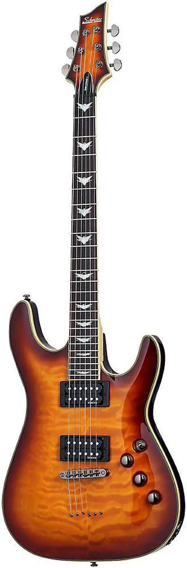 The Schecter Omen Extreme-6 electric guitar is loaded with the features that modern guitarists seek. Like the beautifully carved quilted maple top on a mahogany body with a string-thru body design that adds extra sustain. A comfortable double-cutaway body gives you full access to the fast maple neck fitted with a 24-fret rosewood fingerboard. Dual Schecter Diamond Plus high-output alnico humbuckers provide an array of tones for every musical mood you need to express. The Schecter Omen Extreme-6 guitar's no-nonsense controls include a Master Volume and Tone control with push/pull coil-splitting, and a 3-way toggle switch.