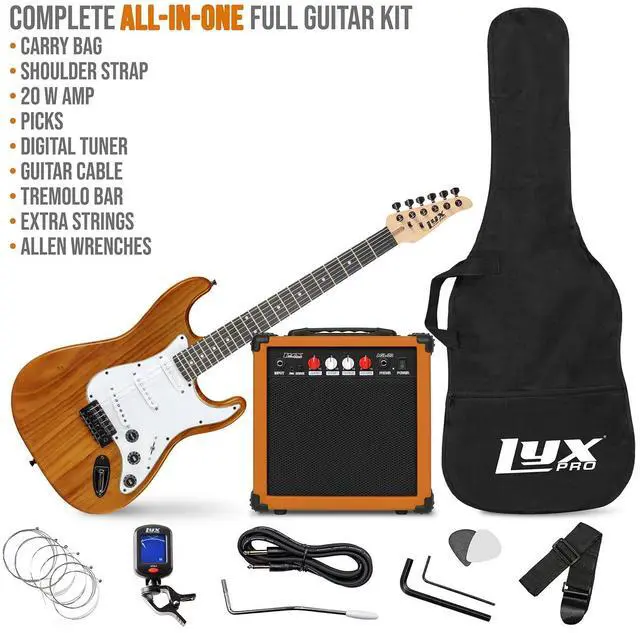 LyxPro 39 inch Electric Guitar Kit Bundle with 20w Amplifier, All Accessories, Digital Clip On Tuner, Six Strings, Two Picks, Tremolo Bar, Shoulder Strap, Case Bag Starter kit Full Size - mahogany