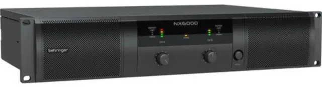 Behringer NX6000, a 2 RU, two-channel 6000W amplifier with built-in SmartSense impedance compensation technology that delivers a linear response at any speaker load impedance. The amplifier also features a zero-attack limiter that provides maximum output level with exceptionally reliable overload protection.