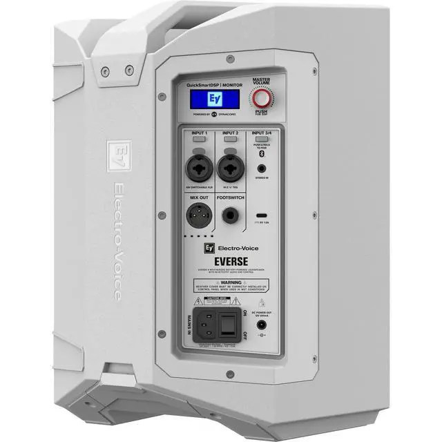 The Electro-Voice EVERSE 8-W is a groundbreaking portable PA system that combines high-performance audio, flexible wireless control, and robust battery-powered operation in a stylish white design. Featuring an 8" woofer and a 1" tweeter, the EVERSE 8-W delivers powerful, clear sound in a compact form factor. Its IP43-rated weatherized design makes it perfect for outdoor events, while the built-in Bluetooth® allows for seamless audio streaming. With the Electro-Voice QuickSmart Mobile app, you can control all functions wirelessly, ensuring easy setup and operation. Whether youâ??re a musician, DJ, or public speaker, the EVERSE 8-W provides professional-grade audio performance anywhere you need it, with a modern aesthetic that suits any event.
