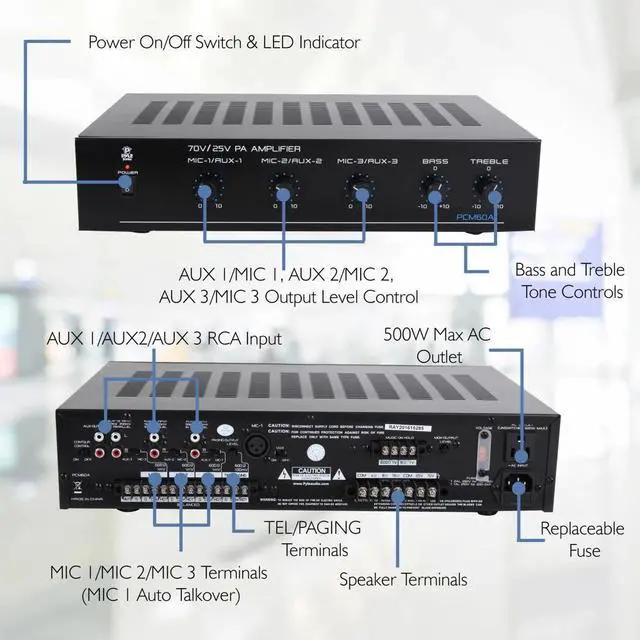 - Includes: Power on/off switch and LED indicator; Contour control on/off loudness switch; AUX/MIC input selector switch; Mute terminals; Detachable AC power input; Replaceable Fuse