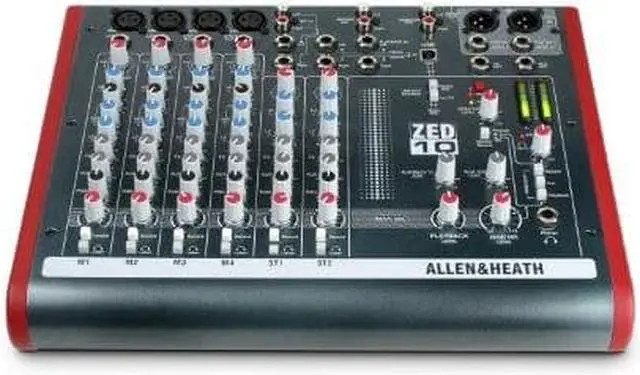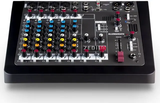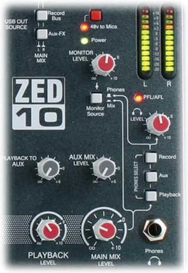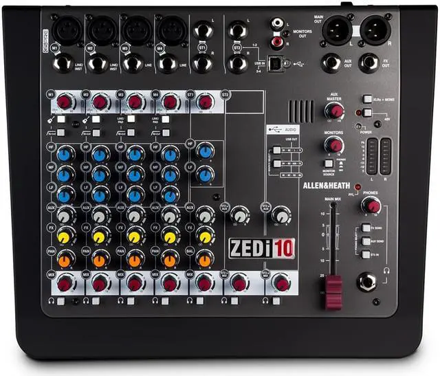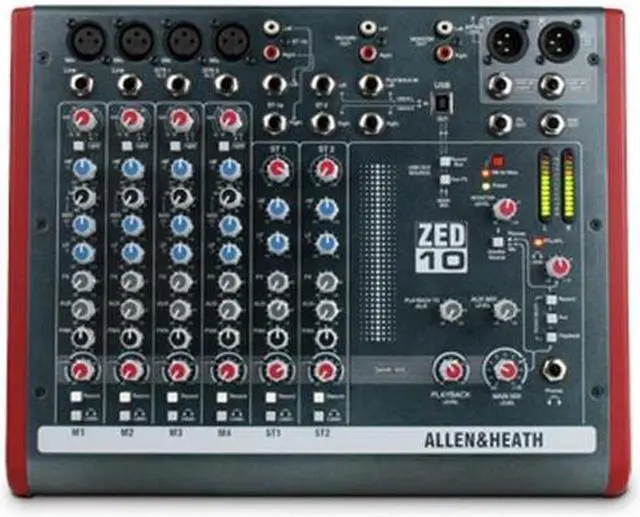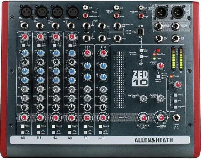 Guitars can be plugged in directly to the mixer using the specially designed high-impedance inputs, while the mixer has two stereo inputs for MP3/CD players or keyboards. Equipped with professional XLR main stereo outputs and a flexible monitoring section with headphone and speaker feed outputs. In the FX version, we’ve added a set of fabulous effects to give shimmering reverbs and enhance your sound. What's great about the ZED-10ZED’s are great for live mixing! The layout makes them very easy to use and easy to achieve a great sound. They are also perfect for recording; either a live show or an audio project at home can be built up track-by-track using the USB digital audio interface. The flexibility and quality of these mixers make them stand out from the crowd. You can plug your guitars or instruments straight into the class A discrete FET high impedance inputs, cater for up to four microphones, two stereo sources with MP3 player compatibility, separate 2-track record outputs and a stereo playback input for 2-track replay or perhaps interval music from a CD player, XLR main stereo outputs with inserts, comprehensive monitoring with headphones and separate monitor speaker outputs, 48V microphone phantom power, DI level switching for sub mixing, and not least of all, the same digital effects algorithms as those used on our flagship digital consoles costing 150 times as much!FeaturesInputsOne of the great things about the ZED series is the number and variety of things you can plug in. In addition to the sixteen mono channels there are two dual stereo channels, each with a main stereo input on jack sockets and with additional inputs on phono sockets. The USB return can be selected to one of the additional inputs so that it feeds either the main LR bus or the stereo channel.Guitar DIIn place of the DuoPre, the ZED-10 has pre-amps similar in design to our MixWizard range of mixers, but with a twist! Inputs 3 & 4 have a high impedance jack input capable of taking either a normal line level or a low level input from a guitar pickup.These newly designed inputs have been crafted with the aim of replicating the sound of a classic guitar or instrument tube pre-amp in a combo or head amp. An extremely high input impedance ensures loading on pick-ups is minimal and a Class A FET (field effect transistor) circuit powered from 48V is employed to give the valve-like gain stage. There is a gain “Boost” switch associated with the guitar inputs which boosts gain by 26dB to cater for instruments with very low level outputs and the overdrive characteristics of the guitar inputs are very similar to a valve (tube) circuit, being asymmetric and soft. All this makes for a wonderfully natural sound to be reproduced from the instrument, full of warmth and character. EQ sectionZED-10 is equipped with a responsive 3-band EQ with MusiQ, an optimized slope (or Q factor) for equalizing individual instruments.Record BusA separately switched stereo bus can be routed to from any channel creating a selective recording bus, monitoring bus or stereo clean feed output. You can even route just the effects processor output to this bus and use the mixer as a high-end effects unit.USB audio flexibilityGetting audio to and from a computer easily is now a common requirement for live sound and music production. The way we have implemented this on ZED is super-flexible and super-easy! No longer do you need to fiddle around the back of your PC to get to the soundcard inputs, only to find that the levels are all wrong and noisy. Just plug in a USB lead to your ZED, select the USB routing on the mixer and the device on your computer and that's it! Quality audio to and from your PC or Mac. Three switches provide different send/return configurations for recording, playback and utilizing external FX.BuildThe ZED-10 has been designed using individual vertically mounted circuit boards with each rotary control fixed with a metal nut to the front panel - making a