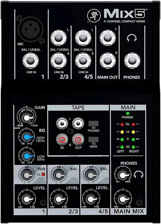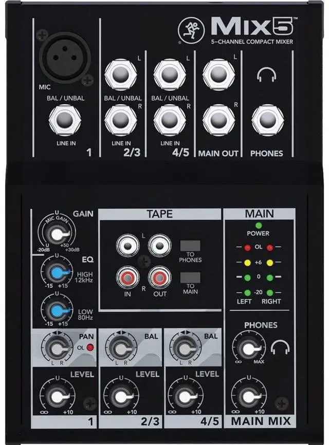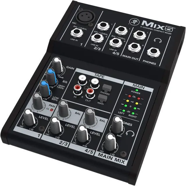 Features: 5-channel compact mixer with proven high-headroom, low-noise performance1 mic/line input with studio-level audio quality2-band EQ with clean, precise tone shapingPhantom power for studio condenser mics2 stereo 1/4" line inputsDedicated stereo RCA inputs/outputs for playback or recordingMain L/R outputs Headphone output with separate volume controlRugged, reliable design built to lastExtremely compact and portableGet your Mackie Mix5 5-Channel Compact Mixer today at the guaranteed lowest price from Sam Ash Direct with our 45-day return and 60-day price protection policy.