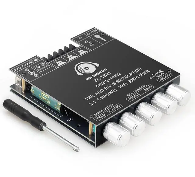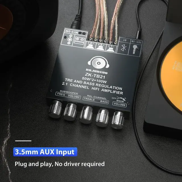 The ZK-TB21 is a 2.1 channel amplifier board equipped with two TPA3116D2 chips, delivering a peak power output of 50W+50W+100W. It supports Bluetooth 5.1 and 3.5mm AUX inputs, making it compatible with most devices and offering convenient connection options for users.