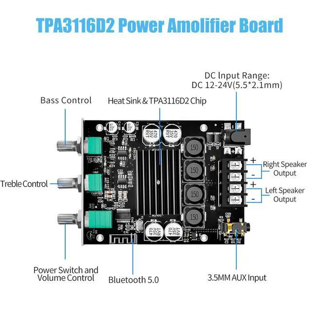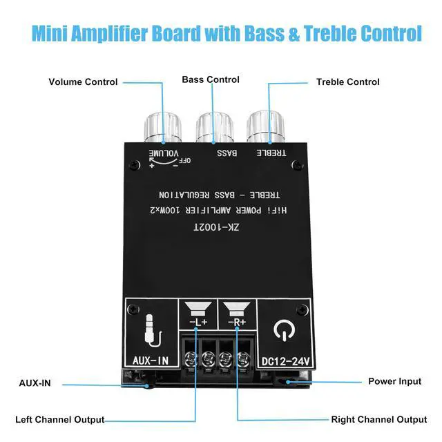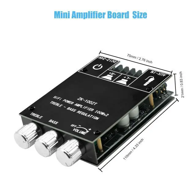 Treble and Bass Control:This digital audio amplifier board with independent treble and bass knob,the treble and bass can be adjusted by these knobs, no need to using the player or speaker