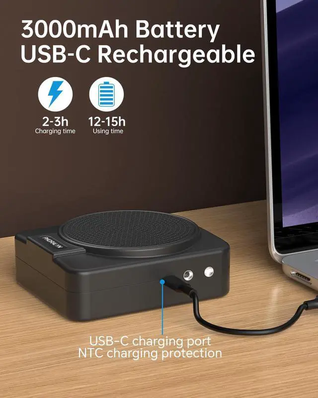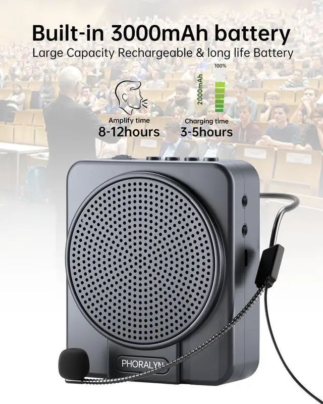 Long Battery LifeBuilt-in a rechargeable 3000mAh lithium battery. The long lasting battery life of 8-12 hours ensures that the voice amplifier can keep up with your demands throughout the day, and it takes only 2 to 3 hours to fully charge.