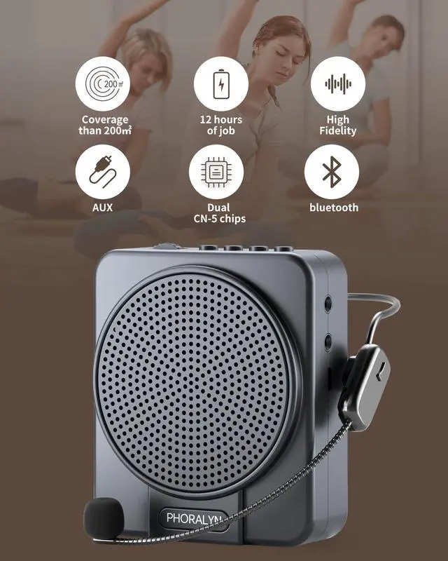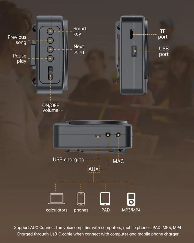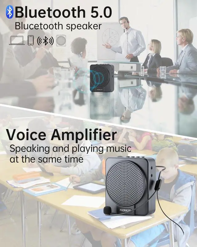 Upgraded Microphone SpeakerThis personal voice speaker offers versatile options for audio playback. Support Bluetooth music, Reverb, Microphone recording, TF (Micro SD) card playing & USB flash drive playing. Not only as a voice amplifier but a music player. It can repeat single tune, loop all music and switch songs.