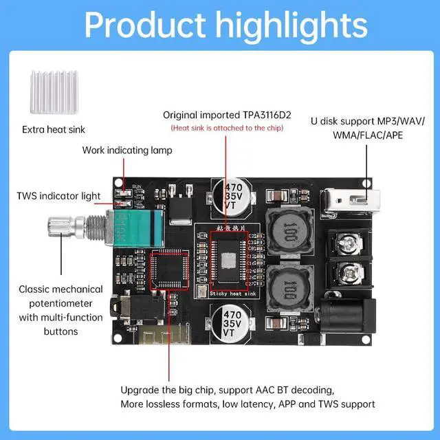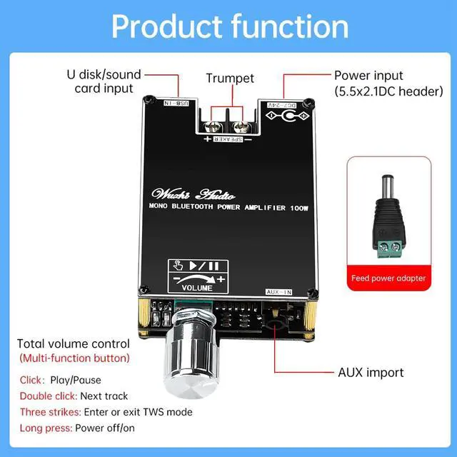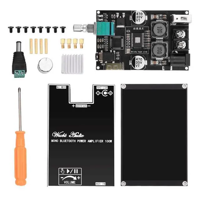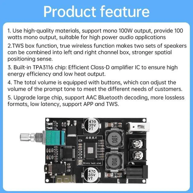 - 100W Mono Power:This 100W mono Bluetooth amplifier board effortlessly drives 20-100W/3-8O passive speakers with DC 7-24V input, featuring a TPA3116D2 chip + dedicated Bluetooth decoder for <0.3% THD and AAC HD audio decoding.