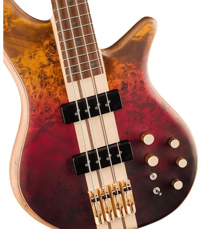 The two-way toggle switch allows for bypassing or engaging the active circuit for the 3-band EQ, ensuring you never lose sound due to a dead battery. An additional three-way toggle switch allows for precise control over a specific mid-frequency range. The Jackson Single-String hardtail bridge enhances individual note attack and improves sustain, making this four-string bass a versatile tool for any professional musician. The unique multi-laminate poplar burl/walnut/maple/walnut/mahogany body not only gives this bass exquisite style, but also improves resistance to environmental stressors. The Nordstrand SB4 single-coil soapbar bridge and neck pickups, featuring alnico V magnets, deliver a sound that's both powerful and articulate.