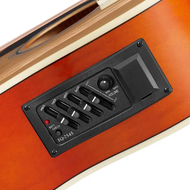This guitar is a Dreadnought design ( 4.5" thick) which creates an unparalleled sound with a deep low end while maintaining overall tone balance. An integrated 4-band pickup equalizer with volume control knob gives you full tonal control when plugged into an amp (not included), and features adjustment slide controls for bass, mid-range, treble and presence. Two sets of steel strings are included (1 set pre-installed, just tune and play; and another set as a spare). These are made from stranded steel cores wound with stainless steel and phosphor-bronze and are coated with a proprietary anti-rust coating.