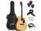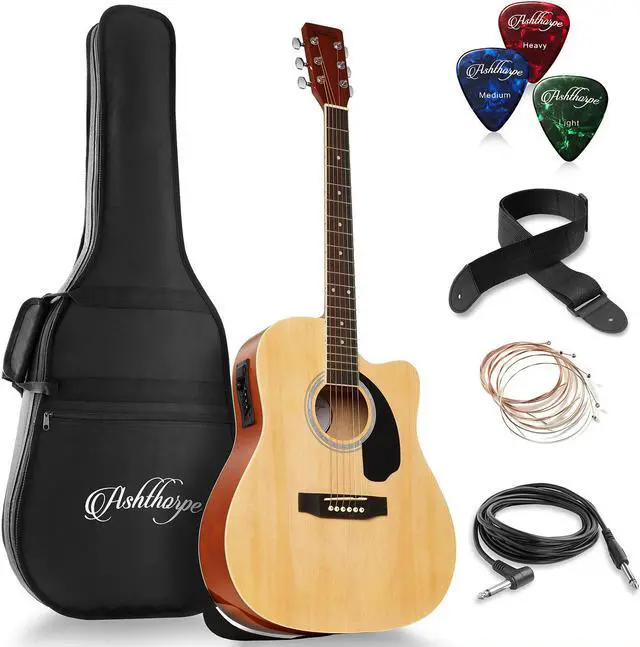 This bundle from Ashthorpe features an acoustic-electric guitar (can be played "Acoustic" without an amplifier, or "Electric" with an amplifier, not included). The guitar body is finely crafted from superior (A-grade) tonewoods; Spruce on top for its superior resilient and musical qualities, and Basswood (similar to Alder) is used for the back and sides for optimum tonal response and warmth. The underside of the soundboard is X-braced for superb structural integrity. The neck is constructed from marine grade Okoume which is extremely strong and balanced. The body is a full size (41") cutaway design, meaning the guitar body near the neck is cut back to allow easier access to the upper frets, making for more comfortable play.