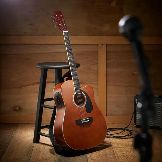 This bundle from Ashthorpe features an acoustic-electric guitar (can be played "Acoustic" without an amplifier, or "Electric" with an amplifier, not included). The guitar body is finely crafted from superior (A-grade) tonewoods; Spruce on top for its superior resilient and musical qualities, and Basswood (similar to Alder) is used for the back and sides for optimum tonal response and warmth. The underside of the soundboard is X-braced for superb structural integrity. The neck is constructed from marine grade Okoume which is extremely strong and balanced. The body is a full size (41") cutaway design, meaning the guitar body near the neck is cut back to allow easier access to the upper frets, making for more comfortable play.