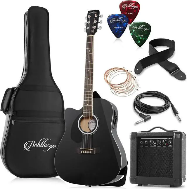 This bundle from Ashthorpe features a left-handed acoustic-electric guitar (can be played "Acoustic" without an amplifier, or "Electric" with the included 10-Watt amplifier). The guitar body is finely crafted from superior (A-grade) tonewoods; Spruce on top for its excellent resilient and musical qualities, and Basswood (similar to Alder) is used for the back and sides for optimum tonal response and warmth. The underside of the soundboard is X-braced for superb structural integrity. The neck is constructed from marine grade Okoume which is extremely strong and balanced. The body is a full size (41") cutaway design, meaning the guitar body near the neck is cut back to allow easier access to the upper frets, making for more comfortable play.