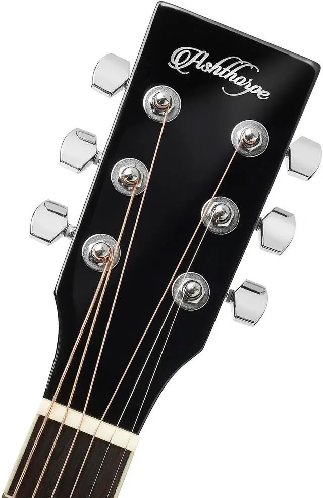 This guitar bundle from Ashthorpe features an acoustic-electric guitar (can be played "Acoustic" without an amplifier, or "Electric" with the included 10-Watt amplifier). The guitar body is finely crafted from superior (A-grade) tonewoods; Spruce on top for its fantastic resilient and musical qualities, and Basswood (similar to Alder) is used for the back and sides for optimum tonal response and warmth. The underside of the soundboard is X-braced for superb structural integrity. The neck is constructed from marine grade Okoume which is extremely strong and balanced. The body is a full size (41") cutaway design, meaning the guitar body near the neck is cut back to allow easier access to the upper frets, making for more comfortable play.