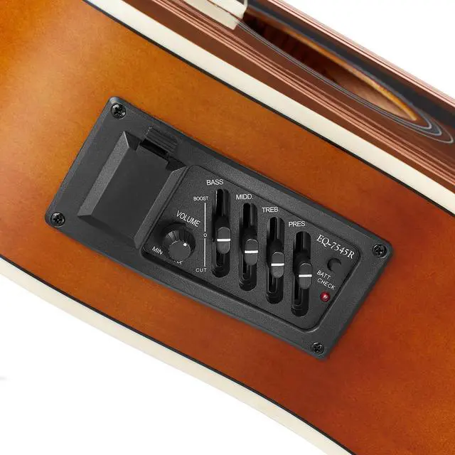 This guitar is a Dreadnought design ( 4.5" thick) which creates an unparalleled sound with a deep low end while maintaining overall tone balance. An integrated 4-band pickup equalizer with volume control knob gives you full tonal control when plugged into the included 10-Watt amp, and features adjustment slide controls for bass, mid-range, treble and presence. Two sets of steel strings are included (1 set pre-installed, just tune and play; and another set as a spare). These are made from stranded steel cores wound with stainless steel and phosphor-bronze and are coated with a proprietary anti-rust coating.