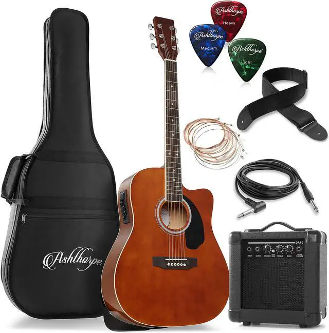 This bundle from Ashthorpe features an acoustic-electric guitar (can be played "Acoustic" without an amplifier, or "Electric" with the included 10-Watt amplifier). The guitar body is finely crafted from superior (A-grade) tonewoods; Spruce on top for its excellent resilient and musical qualities, and Basswood (similar to Alder) is used for the back and sides for optimum tonal response and warmth. The underside of the soundboard is X-braced for superb structural integrity. The neck is constructed from marine grade Okoume which is extremely strong and balanced. The body is a full size (41") cutaway design, meaning the guitar body near the neck is cut back to allow easier access to the upper frets, making for more comfortable play.