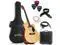 This guitar bundle from Ashthorpe features an acoustic-electric guitar (can be played "Acoustic" without an amplifier, or "Electric" with the included 10-Watt amplifier). The guitar body is finely crafted from superior (A-grade) tonewoods; Spruce on top for its fantastic resilient and musical qualities, and Basswood (similar to Alder) is used for the back and sides for optimum tonal response and warmth. The underside of the soundboard is X-braced for superb structural integrity. The neck is constructed from marine grade Okoume which is extremely strong and balanced. The body is a full size (41") cutaway design, meaning the guitar body near the neck is cut back to allow easier access to the upper frets, making for more comfortable play.