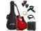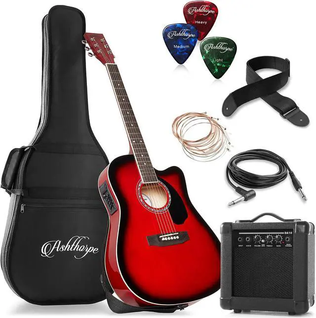This guitar bundle from Ashthorpe features an acoustic-electric guitar (can be played "Acoustic" without an amplifier, or "Electric" with the included 10-Watt amplifier). The guitar body is finely crafted from superior (A-grade) tonewoods; Spruce on top for its fantastic resilient and musical qualities, and Basswood (similar to Alder) is used for the back and sides for optimum tonal response and warmth. The underside of the soundboard is X-braced for superb structural integrity. The neck is constructed from marine grade Okoume which is extremely strong and balanced. The body is a full size (41") cutaway design, meaning the guitar body near the neck is cut back to allow easier access to the upper frets, making for more comfortable play.