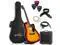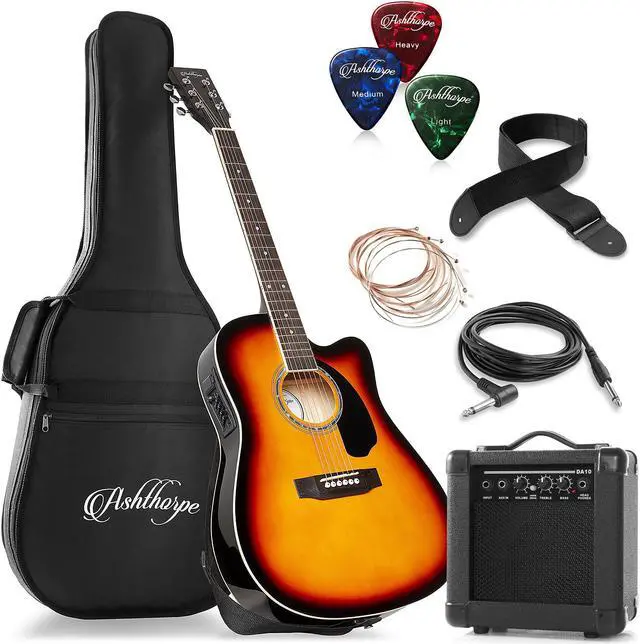 This guitar bundle from Ashthorpe features an acoustic-electric guitar (can be played "Acoustic" without an amplifier, or "Electric" with the included 10-Watt amplifier). The guitar body is finely crafted from superior (A-grade) tonewoods; Spruce on top for its fantastic resilient and musical qualities, and Basswood (similar to Alder) is used for the back and sides for optimum tonal response and warmth. The underside of the soundboard is X-braced for superb structural integrity. The neck is constructed from marine grade Okoume which is extremely strong and balanced. The body is a full size (41") cutaway design, meaning the guitar body near the neck is cut back to allow easier access to the upper frets, making for more comfortable play.