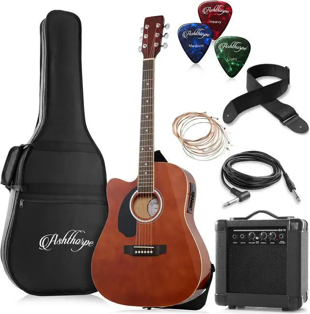 This bundle from Ashthorpe features a left-handed acoustic-electric guitar (can be played "Acoustic" without an amplifier, or "Electric" with the included 10-Watt amplifier). The guitar body is finely crafted from superior (A-grade) tonewoods; Spruce on top for its excellent resilient and musical qualities, and Basswood (similar to Alder) is used for the back and sides for optimum tonal response and warmth. The underside of the soundboard is X-braced for superb structural integrity. The neck is constructed from marine grade Okoume which is extremely strong and balanced. The body is a full size (41") cutaway design, meaning the guitar body near the neck is cut back to allow easier access to the upper frets, making for more comfortable play.