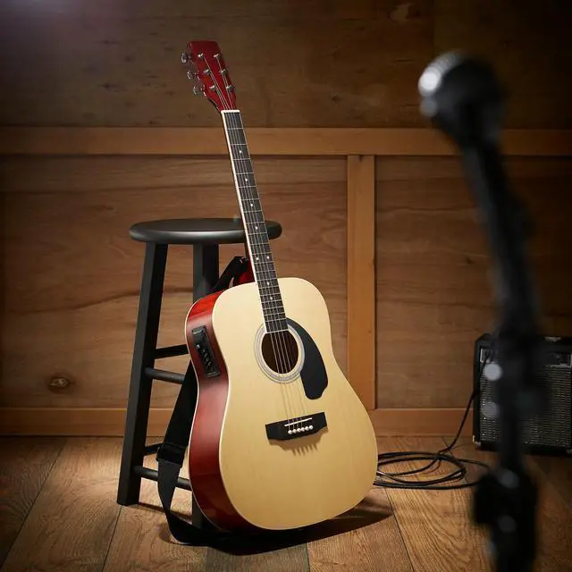 This bundle from Ashthorpe features a top-quality acoustic-electric guitar (can be played "Acoustic" without an amplifier, or "Electric" with an amplifier, not included). The guitar body is finely crafted from top-quality (A-grade) tonewoods; Spruce on top for its superior resilient and musical qualities, and Basswood (similar to Alder) is used for the back and sides for optimum tonal response and warmth. The underside of the soundboard is X-braced for superb structural integrity. The neck is constructed from marine grade Okoume which is extremely strong and balanced. The body is a full size (41") Dreadnought design ( 4.5" thick) which creates an unparalleled sound with a deep low end while maintaining overall tone balance.