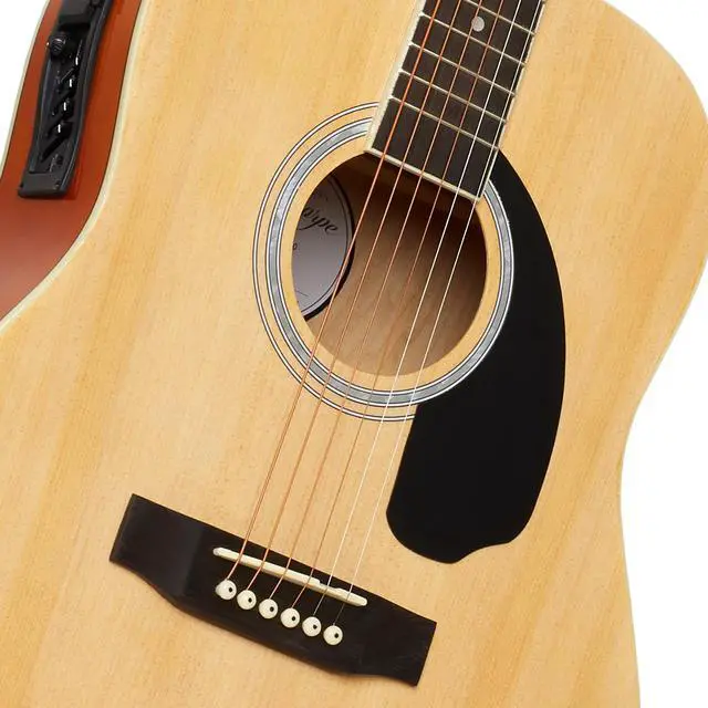An integrated 4-band pickup equalizer with volume control knob gives you full tonal control when plugged into an amp (not included), and features adjustment slide controls for bass, mid-range, treble and presence. Two sets of high-quality strings are included (1 set pre-installed, just tune and play; and another set as a spare). These are made from stranded steel cores wound with stainless steel and phosphor-bronze and are coated with a proprietary anti-rust coating. They're built-to-last and sound great, with a full and perfect blend of warm and bright tones. Professional finishing touches include premium diecast chrome tuning pegs and gorgeous high-gloss finish.