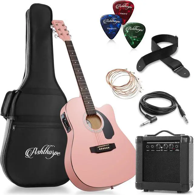 This guitar bundle from Ashthorpe features an acoustic-electric guitar (can be played "Acoustic" without an amplifier, or "Electric" with the included 10-Watt amplifier). The guitar body is finely crafted from superior (A-grade) tonewoods; Spruce on top for its fantastic resilient and musical qualities, and Basswood (similar to Alder) is used for the back and sides for optimum tonal response and warmth. The underside of the soundboard is X-braced for superb structural integrity. The neck is constructed from marine grade Okoume which is extremely strong and balanced. The body is a full size (41") cutaway design, meaning the guitar body near the neck is cut back to allow easier access to the upper frets, making for more comfortable play.