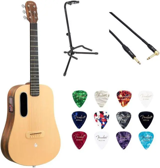 An innovative integration of a spruce top with LAVAs iconic guitar shape and the all-in-one HILAVA 2.0 system. Punchy lows, clean mids and highs, and longer sustain. And with the Pano Sound Field technology, it delivers surround sounds delightful to hear and play. Utilize rich effects without even plugging in. You can freely combine them or adjust their parameters to add unique colors to your sounds. Perform ever expressively on any stage with the LiveDrums App. Inspire, record, and share ideas instantly in the Create App. And learn skills of all levels with the Learn and Practice apps. A stable, durable neck with a carbon reinforcement rod. Light 2.3mm action. Thin heel with easy access to higher frets. Bundle with Classic Celluloid Guitar Pick 351 Shape Medley 12-Pack, Rok-It Tripod Guitar Stand, Kopul Premium 3000 Male Instrument Cable.