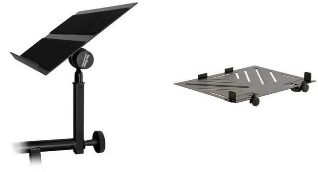 The KSA8585 Keyboard Tray- perfect for small mixers, drum machines, synth modules, effects pedals and small speakers -attaches easily to any one or two-tier stand with 1" round or square tubing. Complete with Posi-lok pivot mechanism for precise angle adjustment, the black powder coat-finished KSA8585 rises 10" (from single tier stands) and includes a hook and loop for safe, secure gear-fastening.