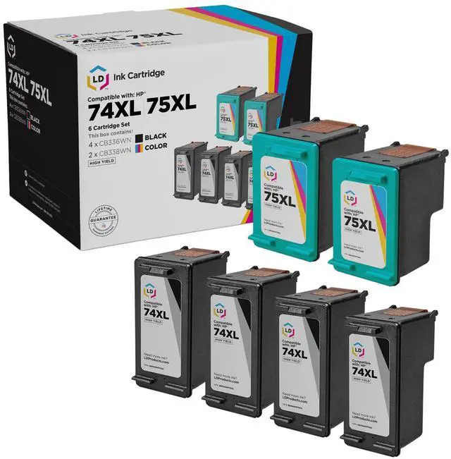 & 75XL ink cartridges: This bulk set of HP 74XL & 75XL inkjet cartridge replacements includes 4 XL black CB336WN ink cartridges, and 2 XL tri-color CB338WN inkjet cartridges. These LD Products remanufactured ink cartridges have been thoroughly cleaned along with the printhead nozzles. Following the cleaning process, we refilled the cartridge with a professionally manufactured pigment-based ink formula for archival print life and color stability. This ink formula is specially designed to produce vibrant and long-lasting prints comparable to HP. After carefully inspecting the shell for leakage and monitoring the electrical circuitry for efficiency, we put the cartridge through a final print test to be certain it is ready to perform. Our remanufactured ink cartridges are not remanufactured by HP. For use in the following printers: OfficeJet J5783, PhotoSmart C4343, Deskjet D4360, PhotoSmart C5280, OfficeJet J5790, OfficeJet J5725, PhotoSmart C5288, PhotoSmart C5275, PhotoSmart C4383, PhotoSmart C4342, OfficeJet J6424, PhotoSmart C5580, PhotoSmart C4440, PhotoSmart C4280, OfficeJet J5780, OfficeJet J5738, PhotoSmart C4588, PhotoSmart C4575, PhotoSmart C4348, PhotoSmart C4344, OfficeJet J5735, PhotoSmart C4450, Deskjet D4260, PhotoSmart C4250, Deskjet D4280, PhotoSmart C4210, OfficeJet J5750, PhotoSmart C4400, PhotoSmart C5550, PhotoSmart C4599, PhotoSmart C4483, OfficeJet J5730, PhotoSmart C5240, PhotoSmart C4380, PhotoSmart C5250, PhotoSmart C52801, PhotoSmart C4435, PhotoSmart C5540, PhotoSmart C4485, PhotoSmart C4472, Deskjet D4363, PhotoSmart C4480, PhotoSmart C4288, PhotoSmart C4270, OfficeJet J6480, OfficeJet J6413, OfficeJet J6410, OfficeJet J5740, PhotoSmart C4240, PhotoSmart D5360, PhotoSmart C5283, PhotoSmart C4550, PhotoSmart C4345. We are the exclusive reseller of LD Products brand of high quality printing supplies.