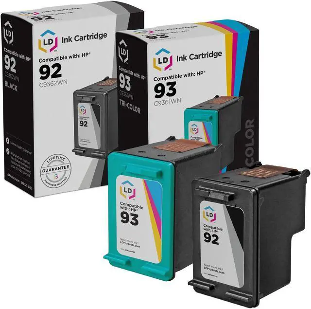 & 93 ink cartridges: This set of HP 92 & 93 inkjet cartridges includes 1 black C9362WN ink cartridge, and 1 tri-color C9361WN inkjet cartridge. These LD Products remanufactured ink cartridges have been thoroughly cleaned along with the printhead nozzles. Following the cleaning process, we refilled the cartridge with a professionally manufactured pigment-based ink formula for archival print life and color stability. This ink formula is specially designed to produce vibrant and long-lasting prints comparable to HP. After carefully inspecting the shell for leakage and monitoring the electrical circuitry for efficiency, we put the cartridge through a final print test.