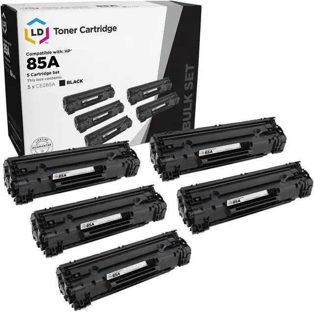 Save even more with our 5 pack remanufactured laser cartridges. This bulk set includes 5 black 85A / CE285A laser toner cartridges. These are replacement cartridges for CE285A (85A) black laser toner cartridges which are manufactured by LD and are that will perform with your printer. LD Products remanufactured replacement CE285A laser toner cartridges are specially engineered to meet the highest standards of quality and reliability you can expect from LD. Our toners have exceptional yields that meet or exceed the (Original Equipment Manufacturer) page yield for the CE285A. Our remanufactured toner 85A contains up to 85% new parts including wiper blades, OPC drums, an electronic smart chip for accurate toner level readout and other internal components.