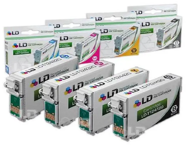 Save even more with our 4 ink cartridge set for the Epson T124 series. This bulk set includes 1 black T124120 (T1241) ink cartridges, 1 Cyan T124220 (T1242), 1 Magenta T124320 (T1243) and 1 Yellow T124420 (T1244), inkjet cartridges. Our T124 cartridges with updated chips now work with all Epson printers, new and old that are remanufactured with T124 cartridges. Why pay twice as much for brand name OEM Epson T124 black and color printer ink cartridges when our generic brand printer supplies deliver excellent quality results for a fraction of the price? Our compatible brand replacement inkjet cartridges for Epson printers are backed by a full 2 year 100% satisfaction guarantee. So Stock up now and save even more! For use in the following printers: Stylus NX420, NX125, NX127, NX430, NX230 Small-in-One, NX130 WorkForce 325, 320, 323, 435. LD Products is the exclusive reseller of LD Products brand of high quality printing supplies on Newegg.